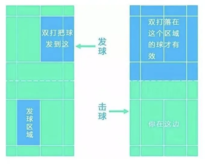 注:双打只有接发球员才能接发球,如果他的同伴去接球或被球触及,发球方得一分。